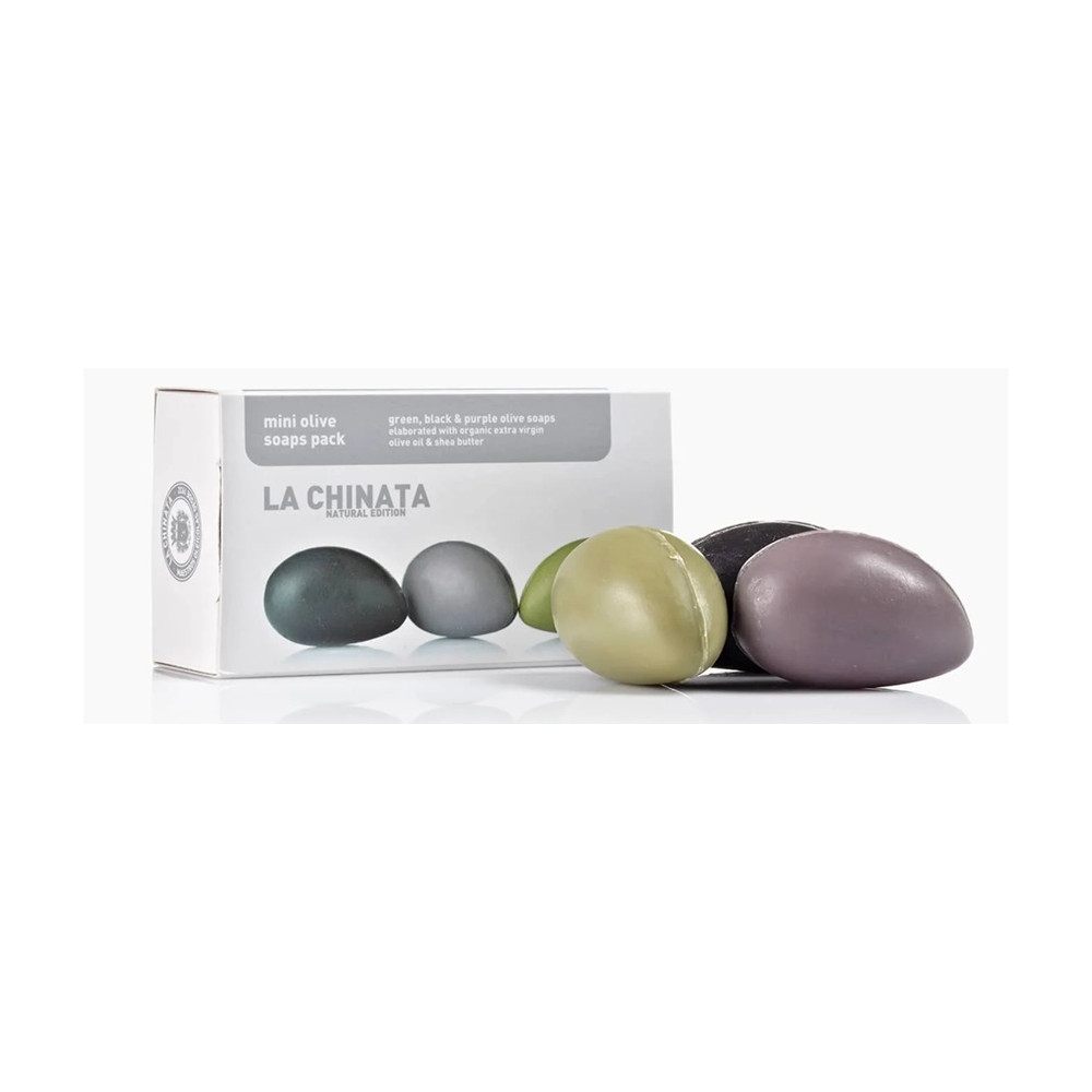 De 3 mini oliven sæber fra spanske La Chinata er fremstillet af deres allerbedste olivenolie som er beriget med naturlige aktive ingredienser såsom sheasmør.