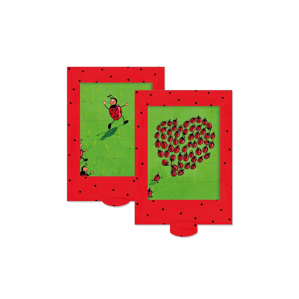 Forvandlingskort som kan skifte billede med mariehøne og hjerte.