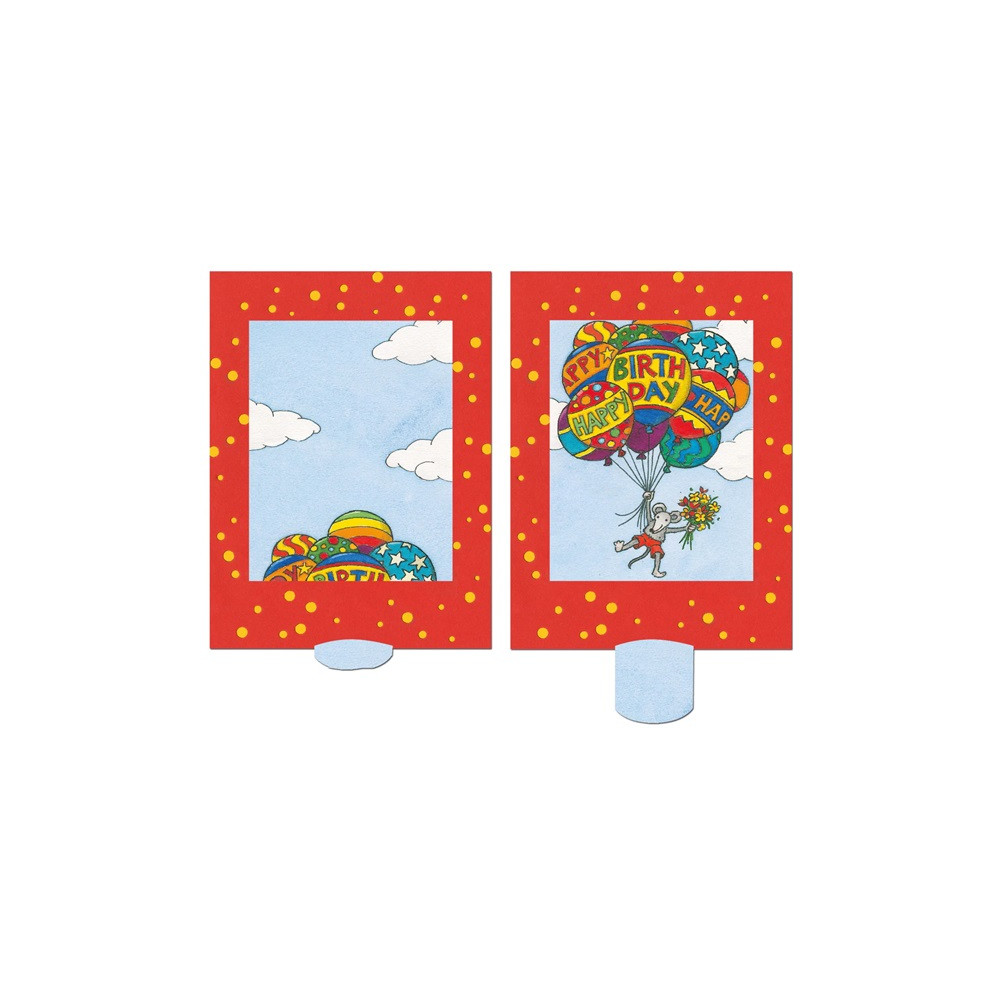 Det fine fødselsdagskort passer både til børn, unge og alle andre med lidt barnesjæl gemt i sindet. Vi tænker de fleste vil elske det fine kort hvor balloner og en buket blomster flyver til vejrs med en fødselsdagshilsen og en sød mus.