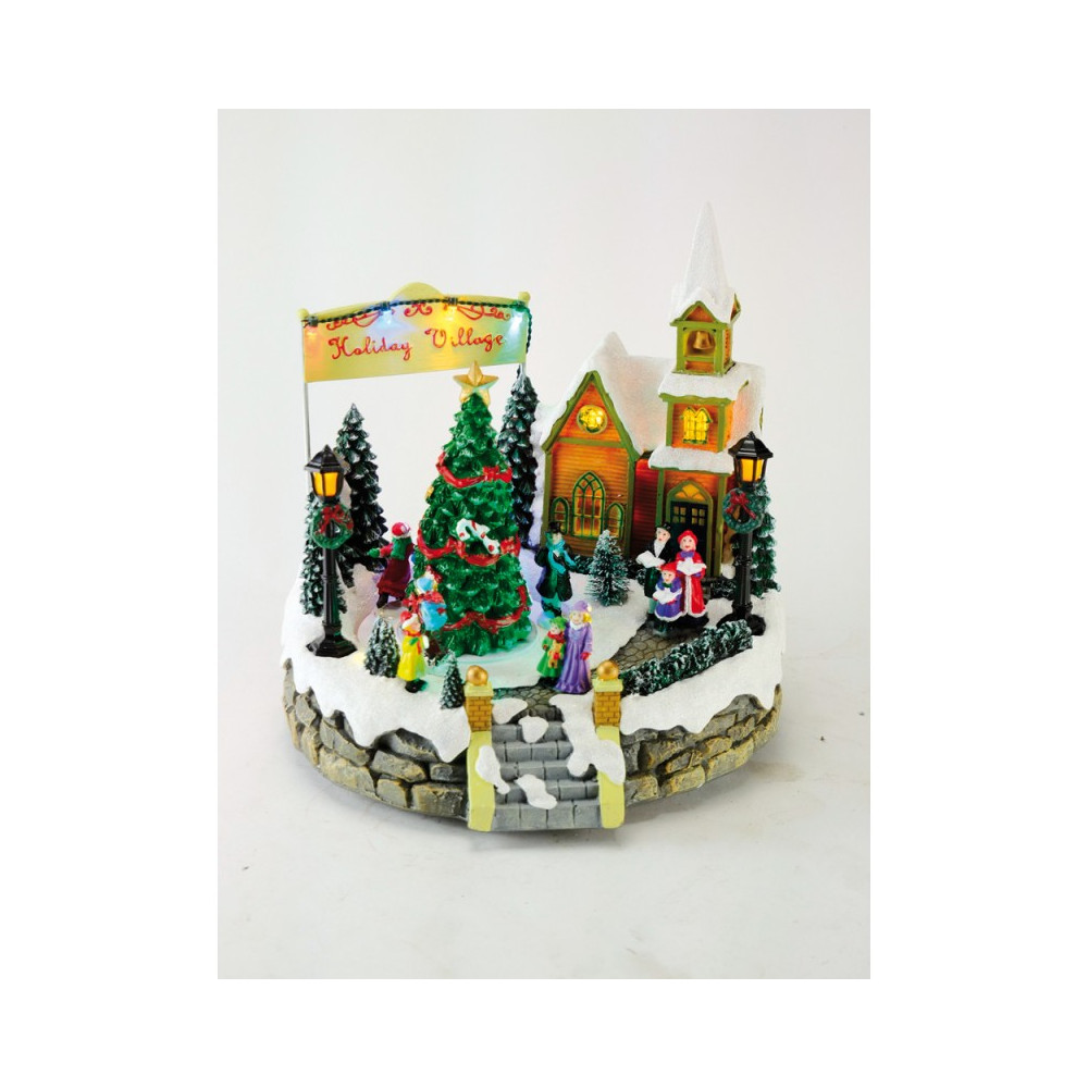 De søde figurer skøjter rundt om det fine juletræ i den fint oplyste julestemning med kirke og sne.